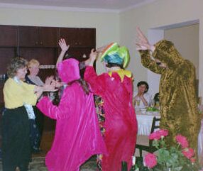 Our training sessions were held in the 3000+ year old town of Osh, which is at the eastern end of the Ferghana Valley along the Silk Road. (Colleague Spee Braun on Suliman Mountain overlooking Osh.) 25 women attended from 4 locations on our third meeting. The sponsoring Kyrgyzstani organization, Foundation for Tolerance International (FTI) had, as usual, organized everything seamlessly. (Photo: FTI's Raya Kadyrova and Anara Eginalieva with other group members.) The groups had been going full tilt since we last worked with their leaders at the University of Delaware in January 2001. They'd some lively new women members and had tackled exciting projects. One group monitored the local border crossing situation and actually got a few of the more abusive guards fired and crossing rules regularized. Another had a meeting after Sept 11 about terrorism that attracted 400 attenders from their mountainous rural region. Other groups are getting women the legal information they need about domestic violence, and all the groups are sources of good information for communities that have no TV, no radio, no newspapers, no libraries, no internet. This time, against high odds, they'd managed to get a woman from Uzbekistan and 2 women from Tadjikistan These closely-related groups have been cruelly separated by new and arbitrary national boundaries after the USSR was dismantled. Weak economies have caused serious disrepair of infrastructure and an increase in drug smuggling and fundamentalist Islam among unemployed young men. As a result, dormant ethnic differences in the region have heated up. (See ISAR's excellent one-page overview of the Ferghana Valley situation.) The women have found themselves dealing with officials at all levels, and gave full attention to my sessions on negotiation skills and about gender and age dynamics in conflict. We spent significant time discussing men and violence. Almost all warfare and most violence is perpetrated by men--what does that mean for women in their lives and in their organizing work? There was political uproar in Kyrgyzstan the week we were there. Police had killed a number of peaceful demonstrators several weeks before, and in response 10,000 (!) people came to block the one and only mountain pass road between the Ferghana Valley and the capital city to the north. The prime minister and other key officials resigned. The crowd dissipated when rain came.... nonviolent tactics winning for the moment. We spent late nights talking about what the women might do to help the current volatile situation. The final evening was a blow-out party, with toasts, skits, poems, songs, reams of gifts, and delicious dancing. Peacemaking work carried out in well-organized community, with compelling goals, external support, and a good dose of playfulness, is what keeps these strong women going. |